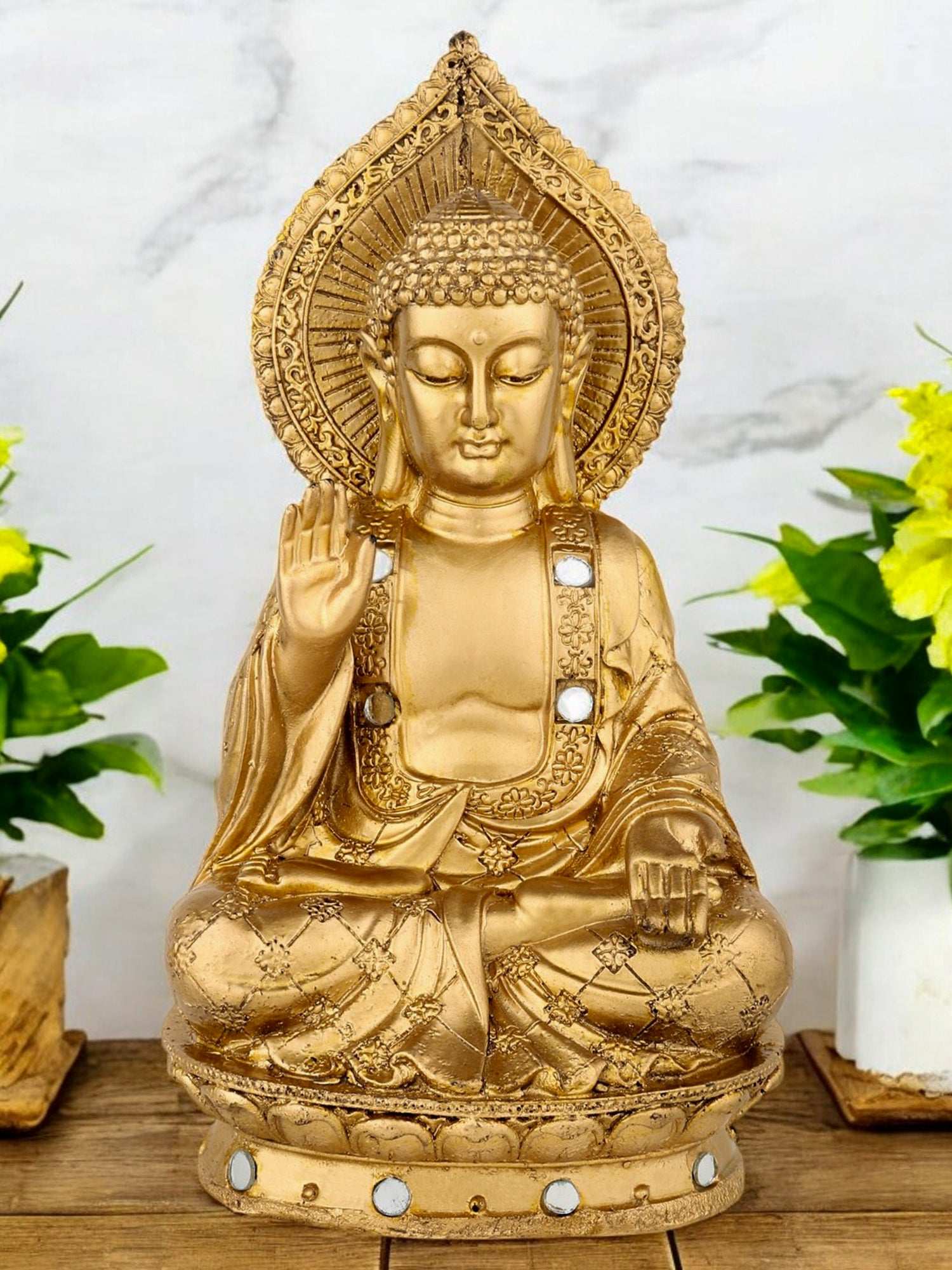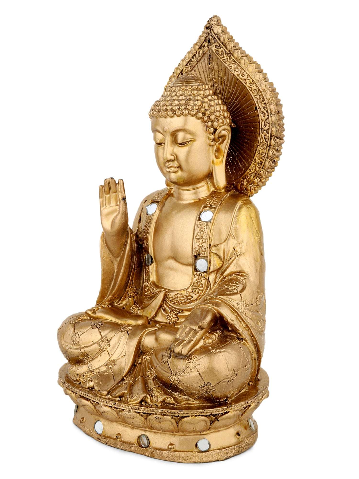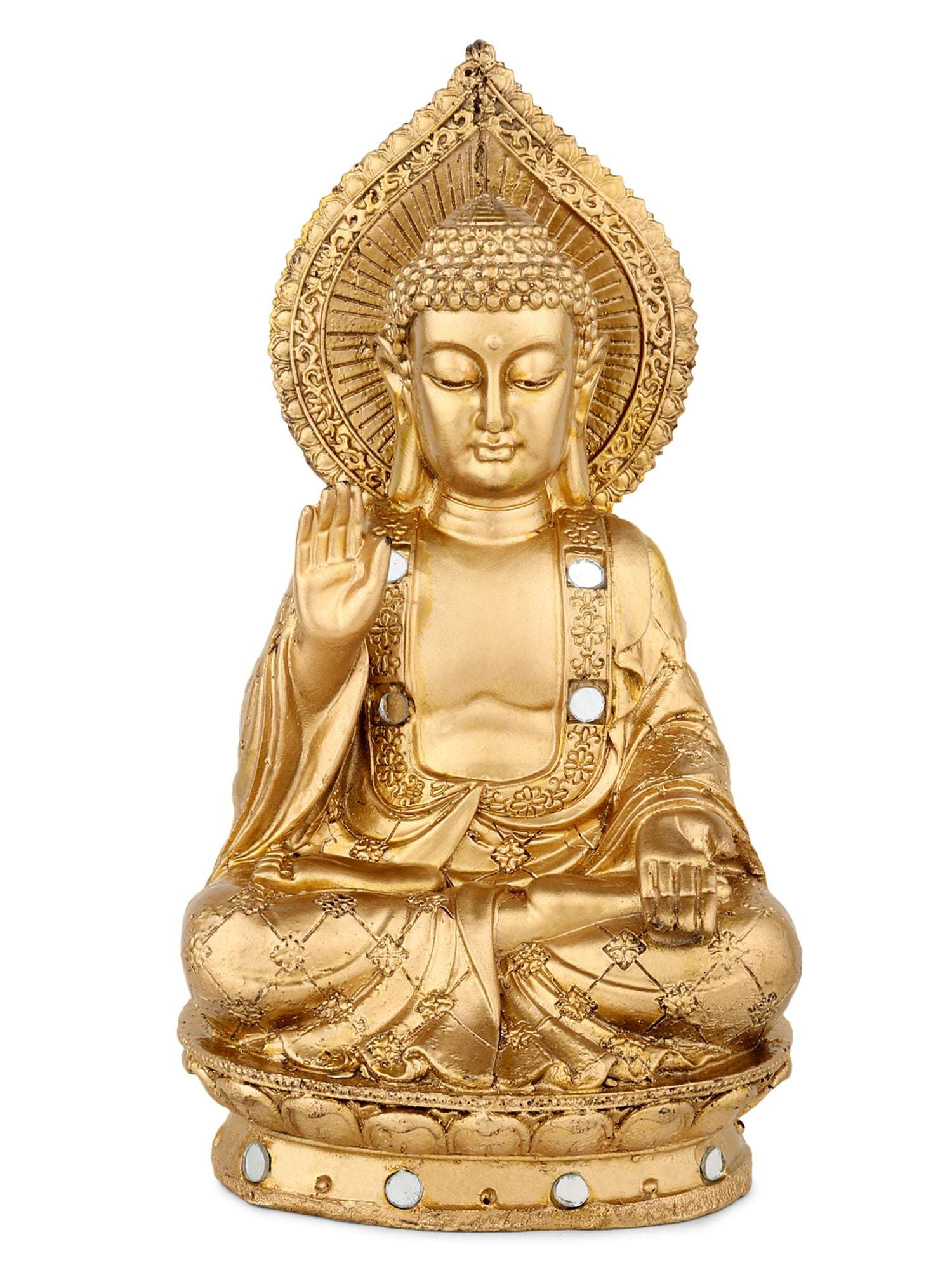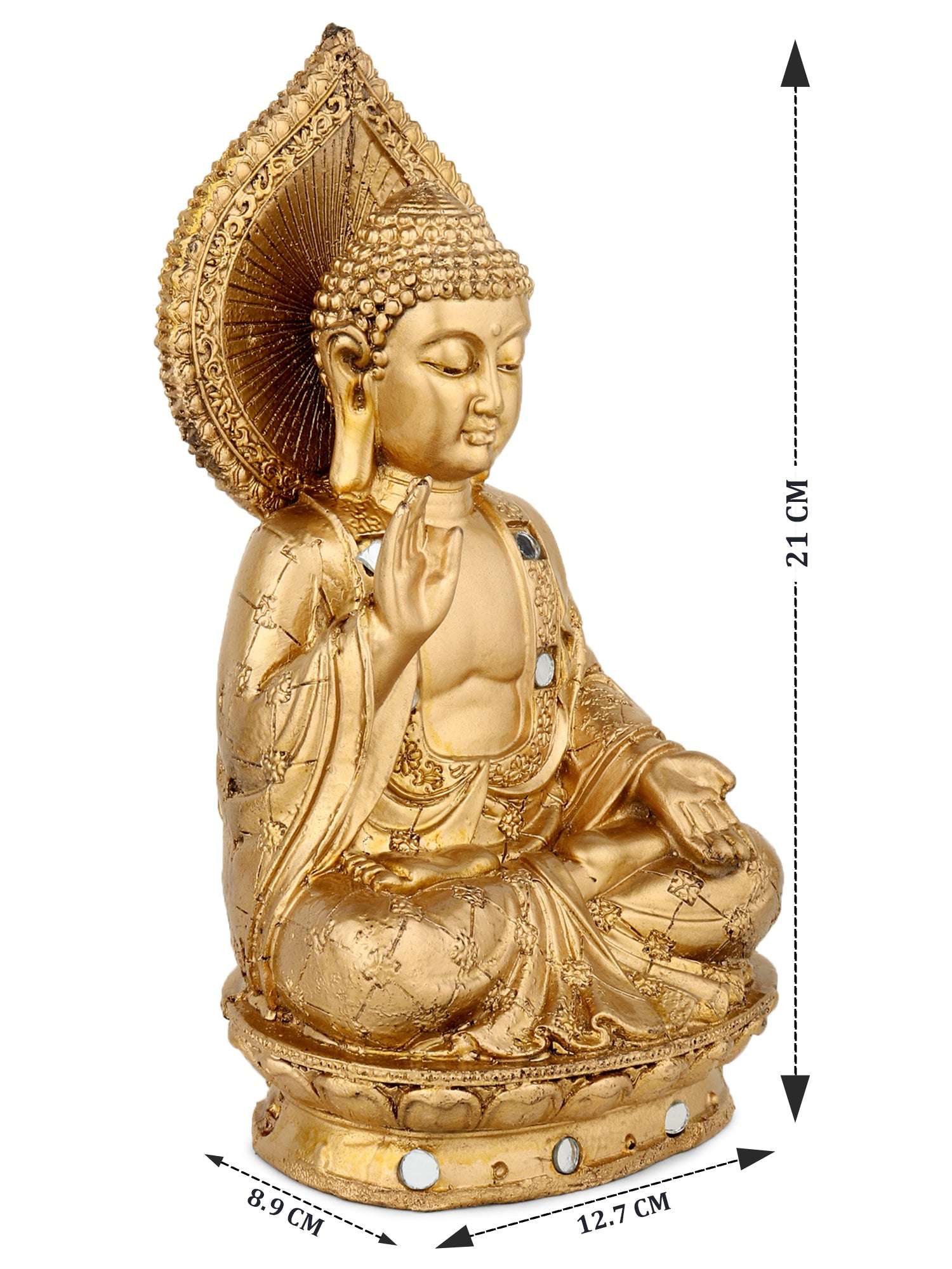 Elevate your home décor with the exquisite Decorative Buddha Statue Blessing (Gold) by Vivars Home. This stunning figurine radiates peace and tranquility with its intricate detailing and luxurious gold finish. Measuring Dimensions: 6 x 4 x 10 inches, this statue is perfect for adding a touch of elegance to any space. Crafted with high-quality materials, this Buddha statue is a symbol of blessings and positivity. The unique design and serene expression make it a standout piece in any room. Ideal for meditation spaces, living rooms, or as a thoughtful gift for loved ones.