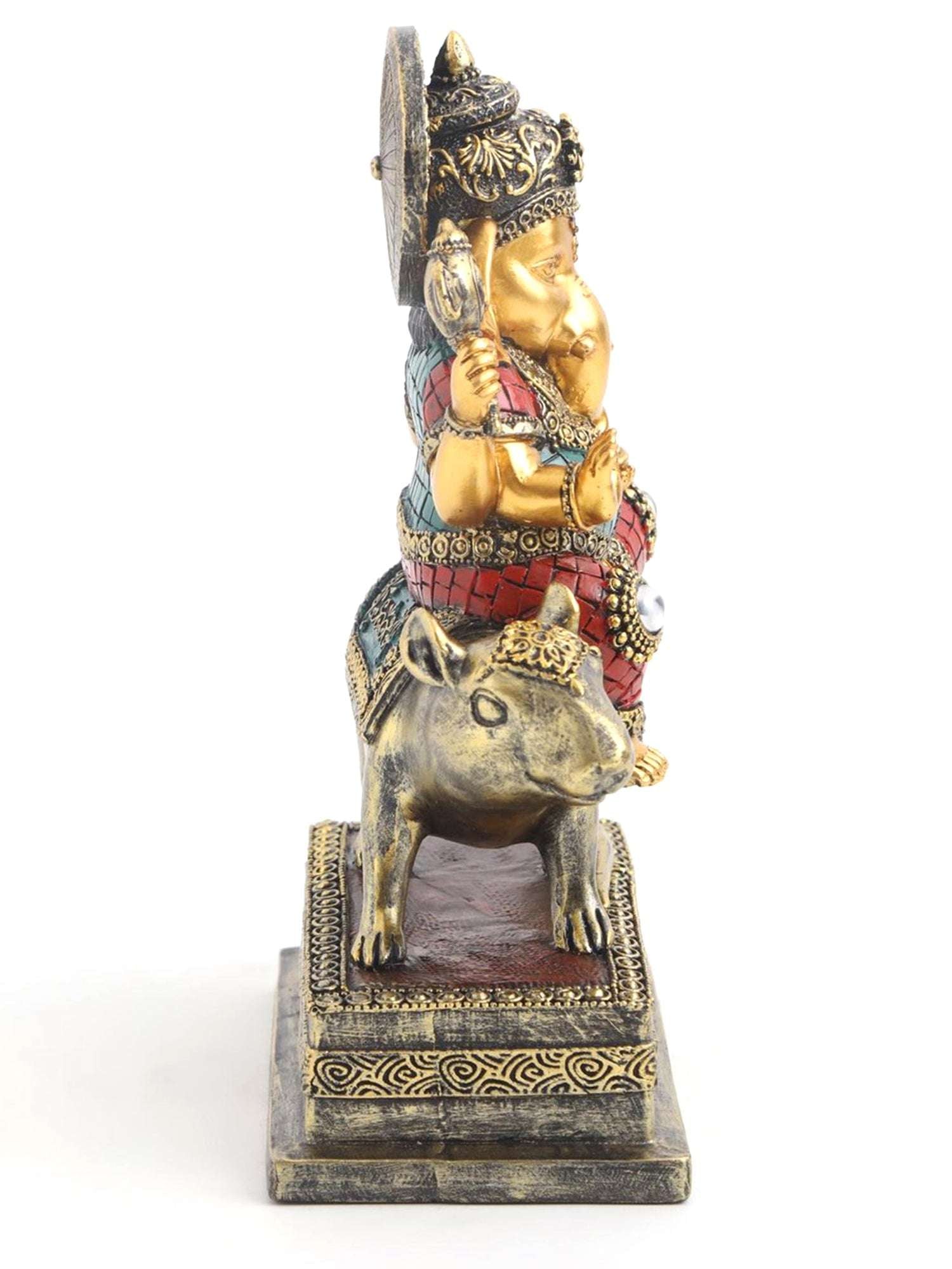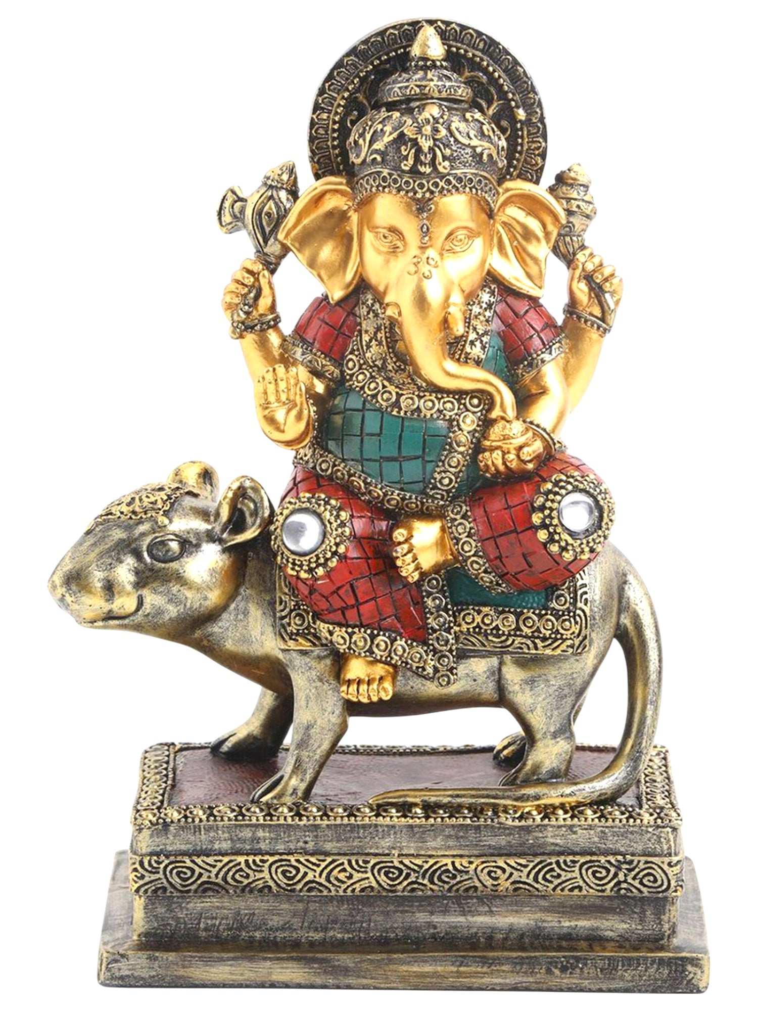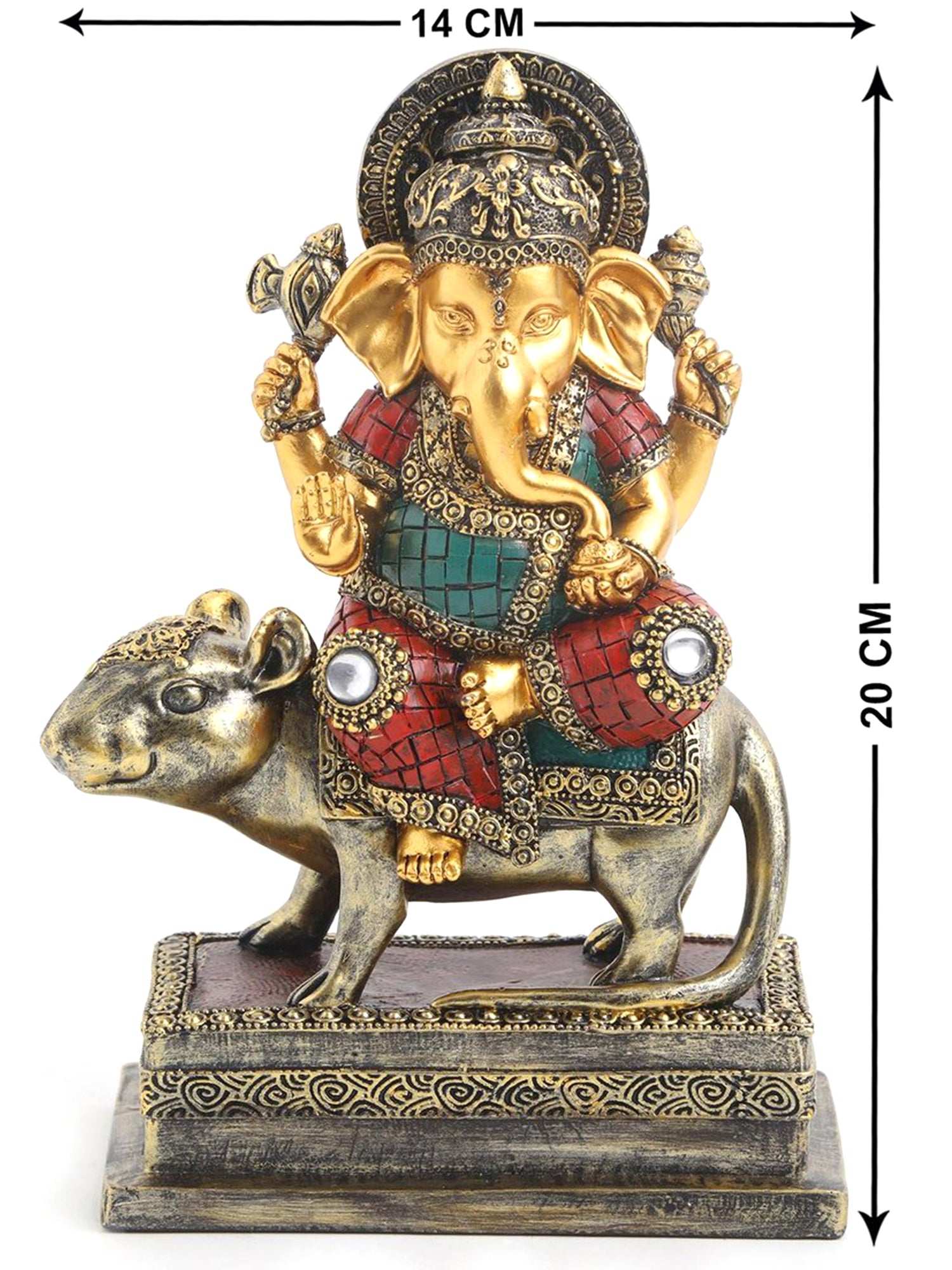 Enhance your spiritual space with this expertly crafted Polyresin Lord Ganesha on Mouse Figurine. Ideal for adorning your pooja room, home office, or car dashboard, this figurine represents Ganesha seated on his vahana, the mouse. Made with high-quality polyresin and adorned with vibrant colors, it brings a sense of divinity and sophistication to any environment.
