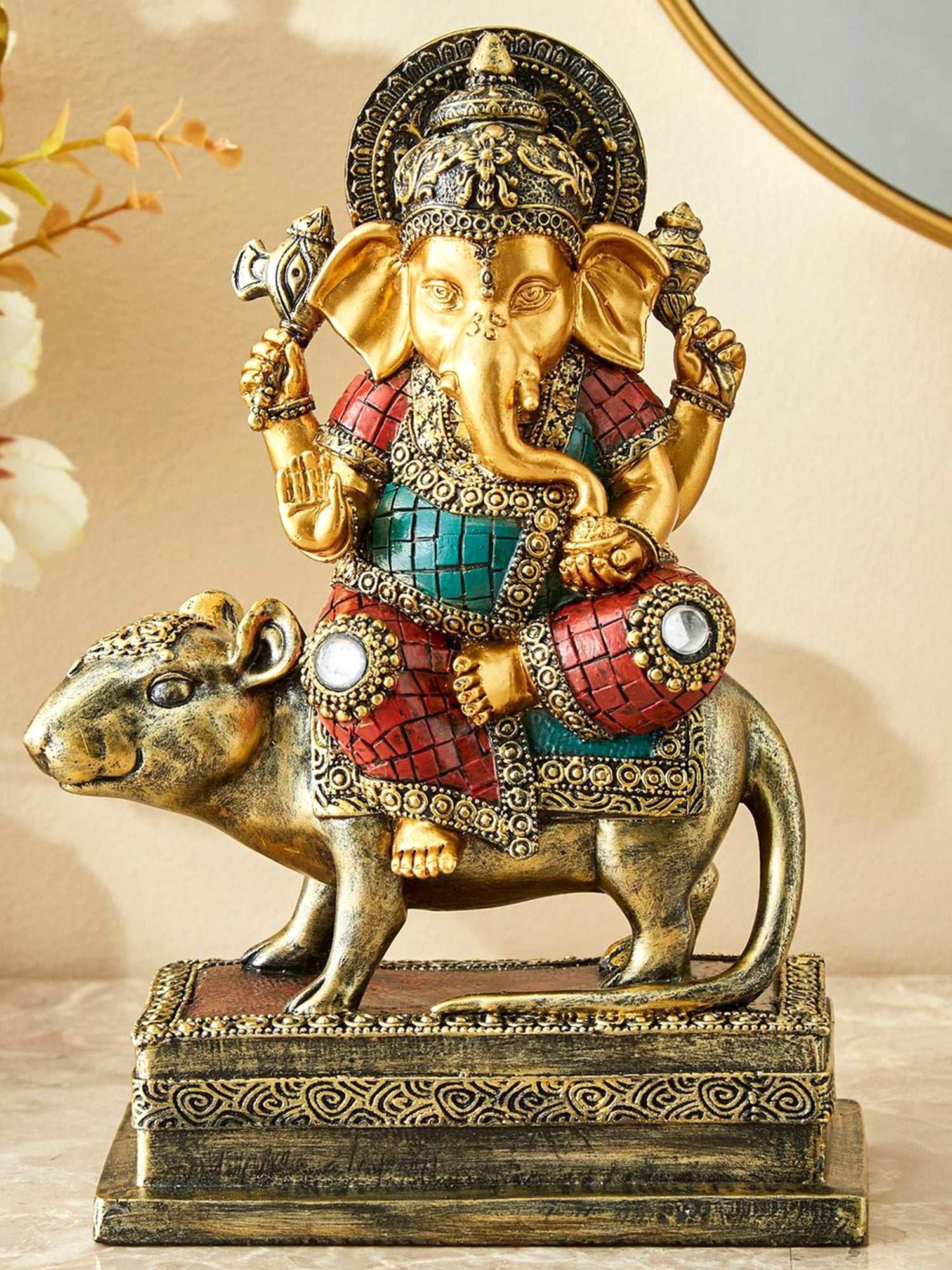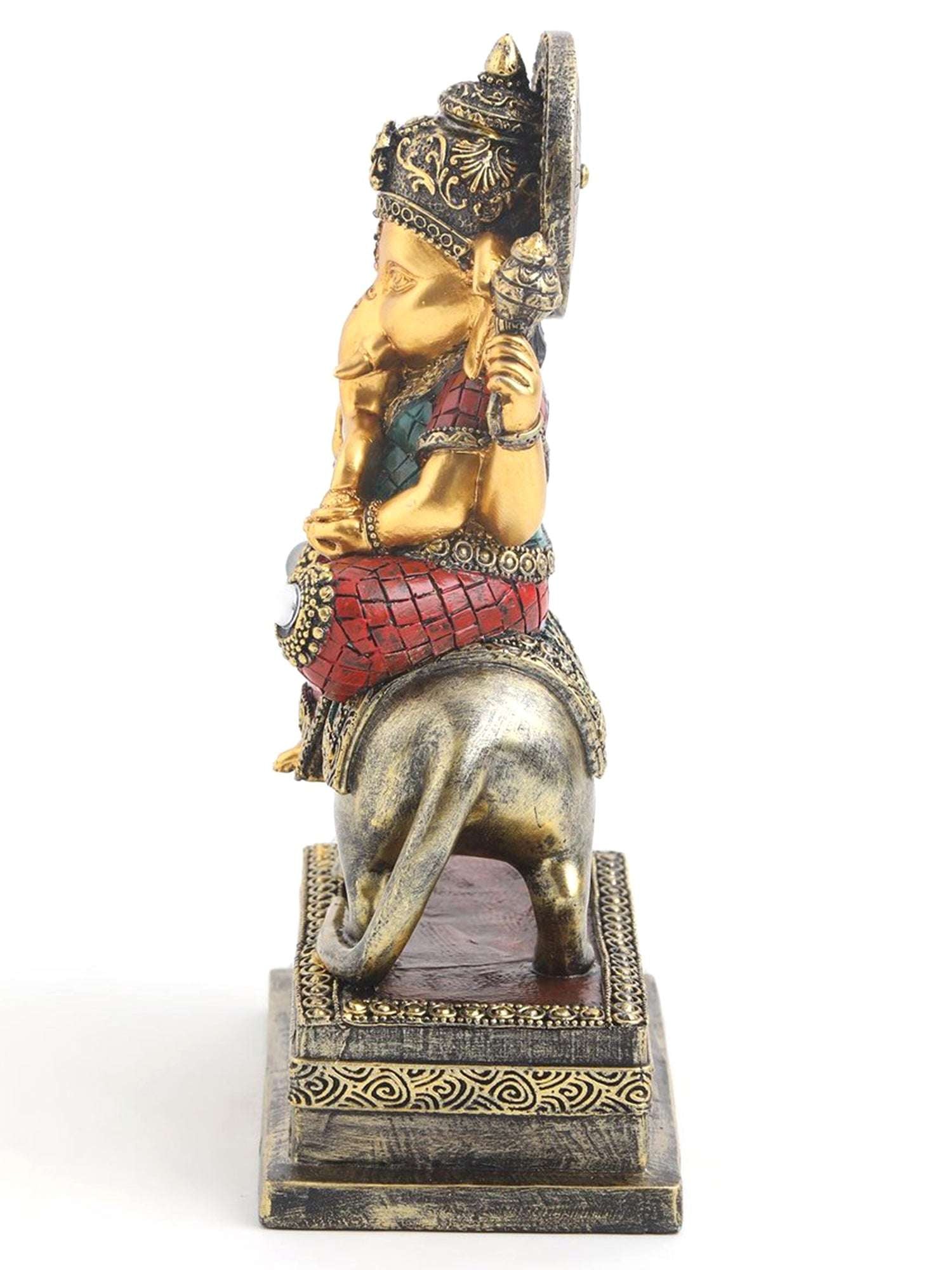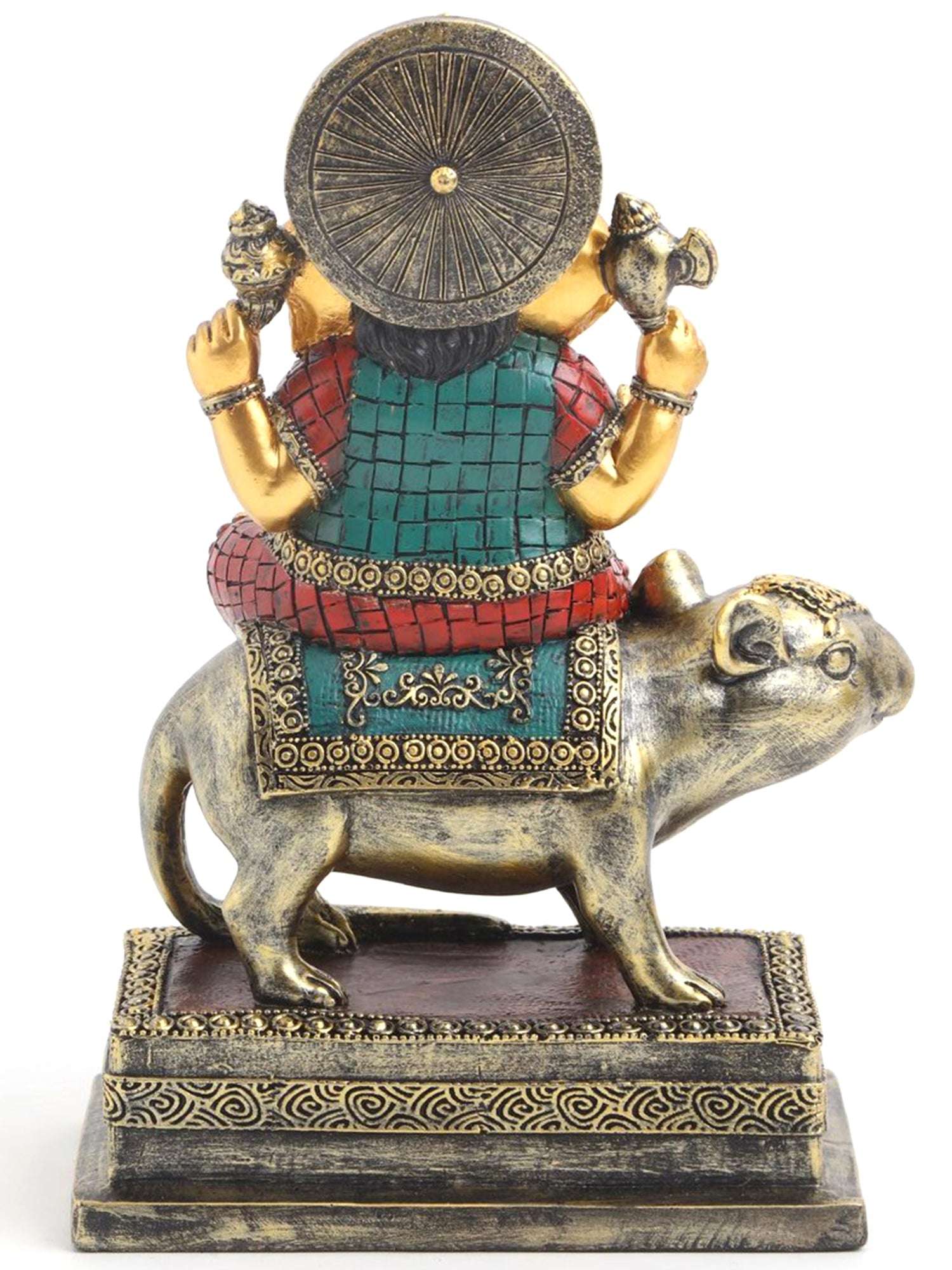 Enhance your spiritual space with this expertly crafted Polyresin Lord Ganesha on Mouse Figurine. Ideal for adorning your pooja room, home office, or car dashboard, this figurine represents Ganesha seated on his vahana, the mouse. Made with high-quality polyresin and adorned with vibrant colors, it brings a sense of divinity and sophistication to any environment.